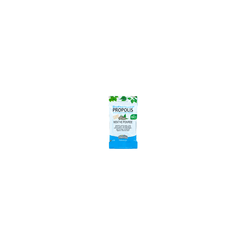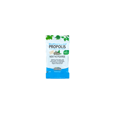 Pastilles bio à la menthe poivrée et à la propolis : Gomme d'acacia*, extrait sec de propolis*, huile essentielle de menthe poivrée* (1,12 %), inuline d'agave*, agent de charge : carbonate de magnésium. Chaque pastille contient 15 mg de propolis. Sans conservateurs ni colorants artificiels. 100 % d'origine naturelle. À conserver à température ambiante.